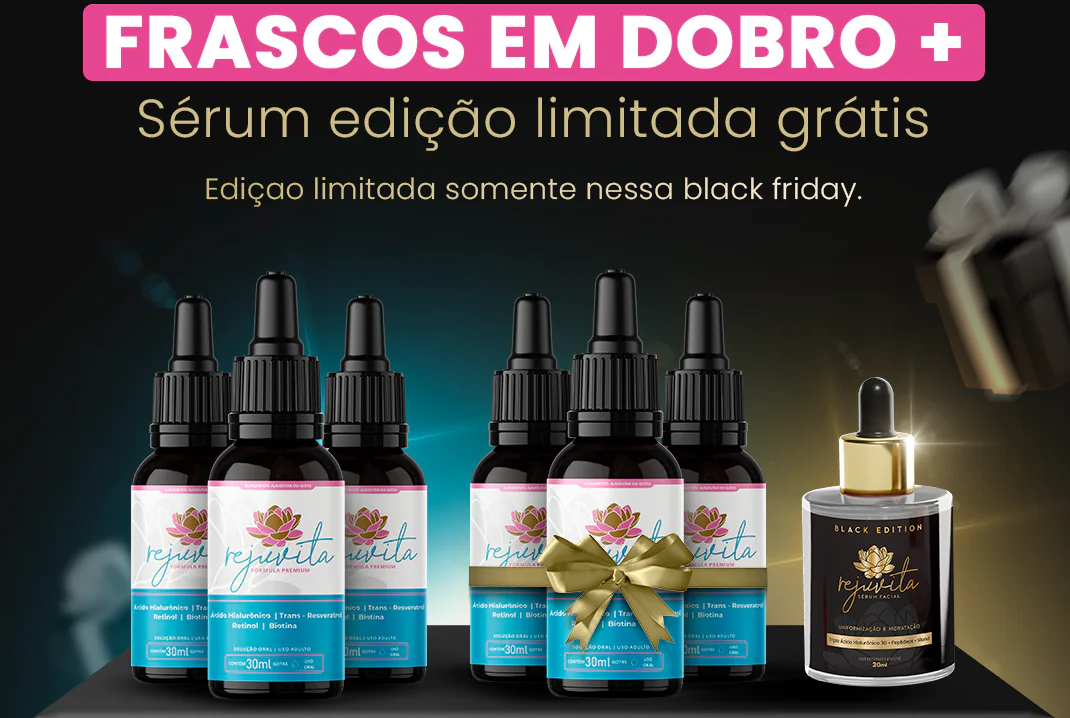 Durante a Black Friday Rejuvita, você paga o valor normal e recebe o dobro de frascos — equivalente a 50% de desconto real, sem cupom e sem pegadinhas.
