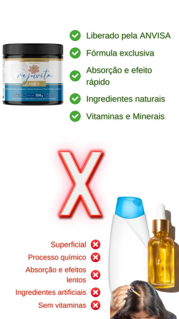 Enquanto os tratamentos tradicionais como óleos, tônicos e máscaras capilares agem apenas na parte externa do fio, o Hair+ atua na raiz do problema, nutrindo seu organismo de dentro pra fora.